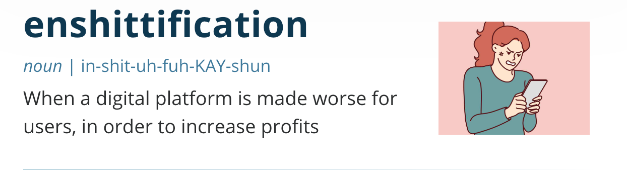 The same will happen with AI one day. We're only in stage 1 of the enshittification of it, which is the stage where users benefit the most and platforms gain millions of users before changing prices, adding ads, or cutting quality – think early Netflix streaming or young Twitter to how they both are now.